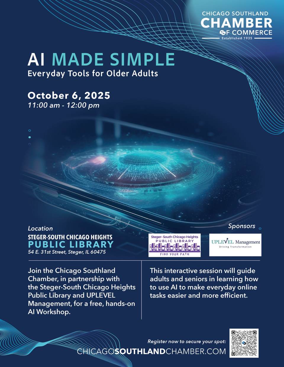 Please join the Chicago Southland Chamber of Commerce, in partnership with the Steger-South Chicago Heights Public Library and UPLEVEL Management, for a free, hands-on AI Workshop. This interactive session will guide adults and seniors in learning how to use AI to make everyday online tasks easier and more efficient.
