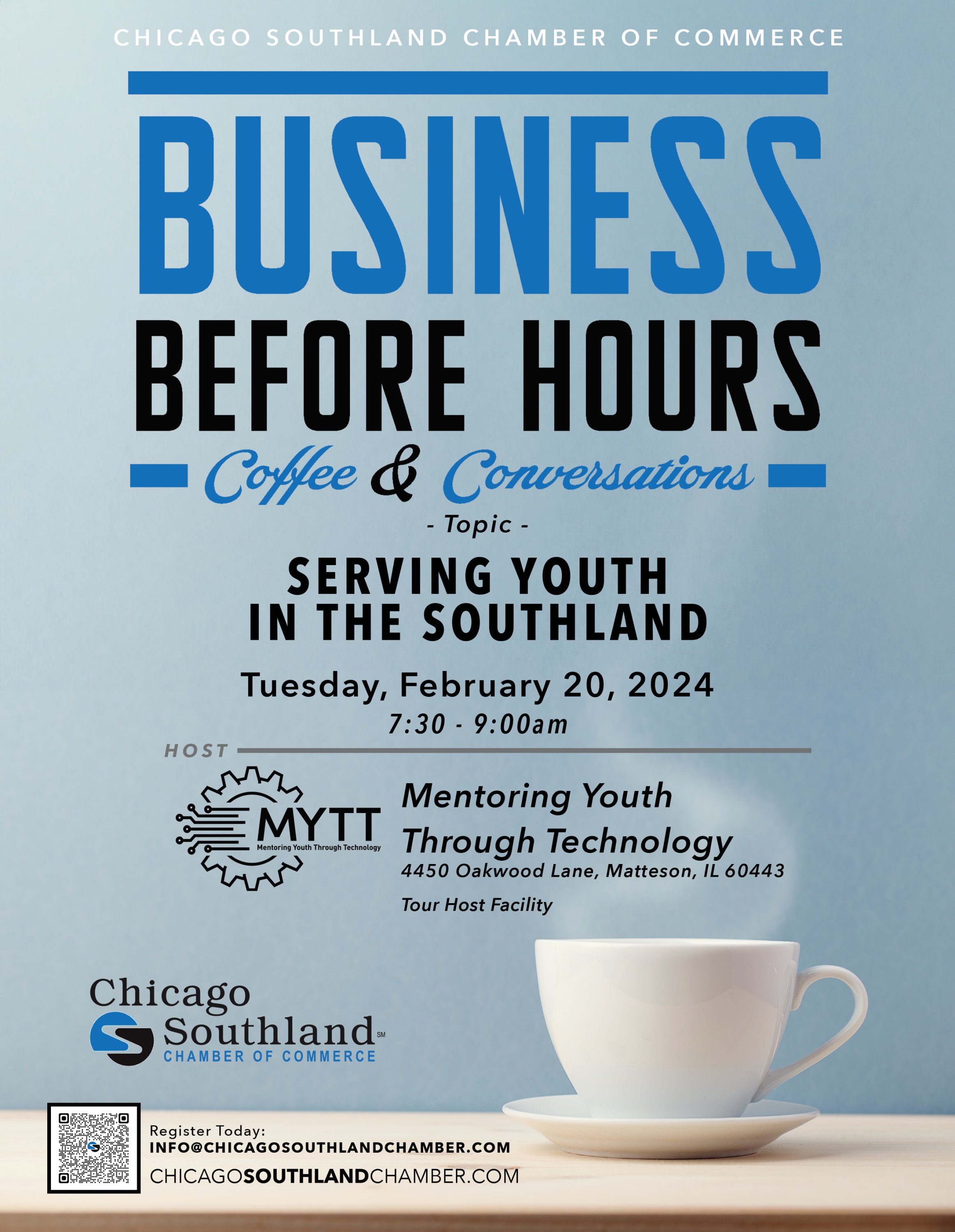 We are excited to invite you our Business Before Hours: Coffee and Conversations, hosted by the Chicago Southland Chamber of Commerce in collaboration with MYTT (Mentoring Youth Through Technology) for an insightful discussion on "Serving Youth in the Southland." This event begins at 7:30 am on February 20th for a unique opportunity to network with fellow business leaders, public servants and industry experts. Please register online to secure your spot. We look forward to meeting you soon!