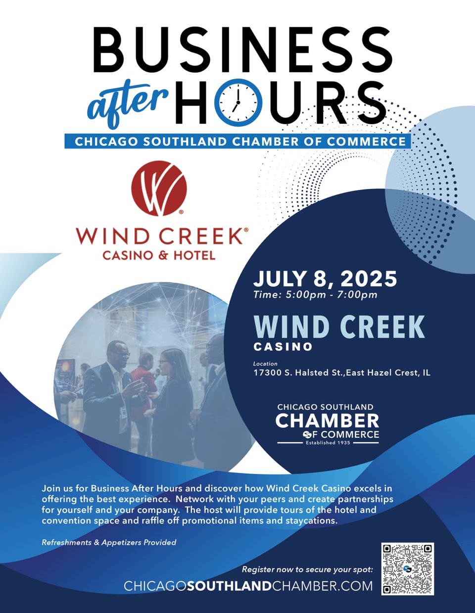 Join us for our Business After Hours event hosted by Wind Creek Casino, on Tuesday, July 8, 2025, from 5:00 pm - 7:00 pm. Discover how Wind Creek Casino excels in offering the best experience.
