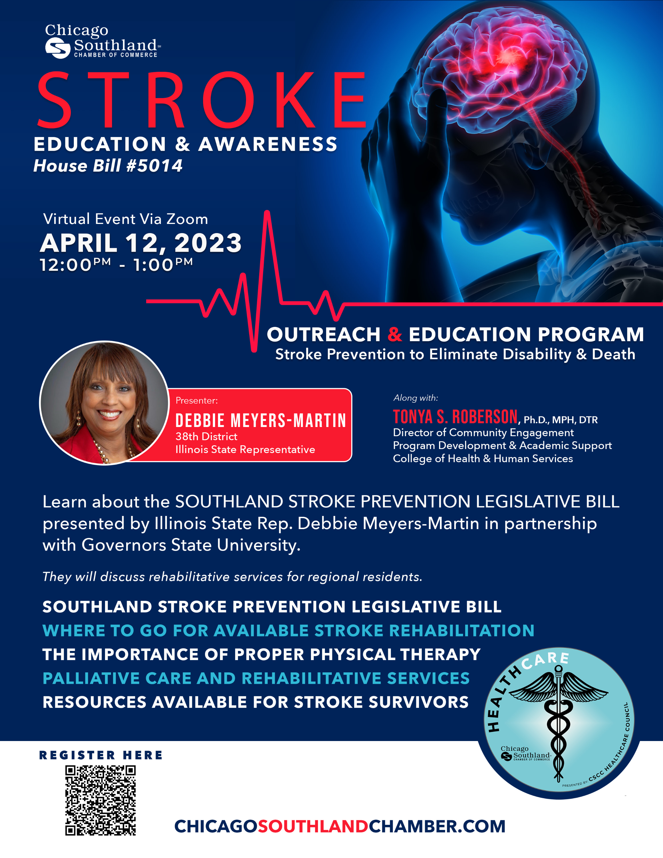 Join this discussion to learn more about 'The Stroke Education and Awareness Bill HB #5014,' as presented by Illinois State Representative Debbie Meyers-Martin, and how it will pave the way for Governors State University- College of Health and Human Services to collaborate with other academic/ medical institutes and community-based organizations to develop an outreach and education program to raise awareness of stroke, prevention and eliminate disability and death through increasing knowledge about causes and risks, signs and symptoms, necessary action and treatment, self-advocacy, and recovery support within Chicago's Southland communities. Illinois State Representative 38th District Debbie Meyers-Martin Tonya S. Roberson, Ph.D., MPH, DTR Director of Community Engagement, Program Development, and Academic Support College of Health and Human Services Additional panelists will join the conversation to discuss rehabilitation, physical therapy, palliative care, and more services for stroke victims.Images