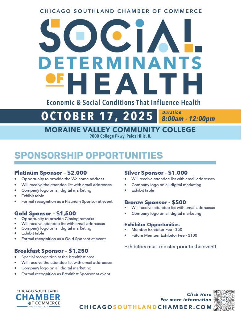The Chicago Southland Chamber of Commerce invites you to be part of an engaging and timely panel discussion focused on addressing the gaps in Social Determinants of Health across our region. This impactful event will feature three dynamic panel discussions under the theme "Connecting the Dots."
