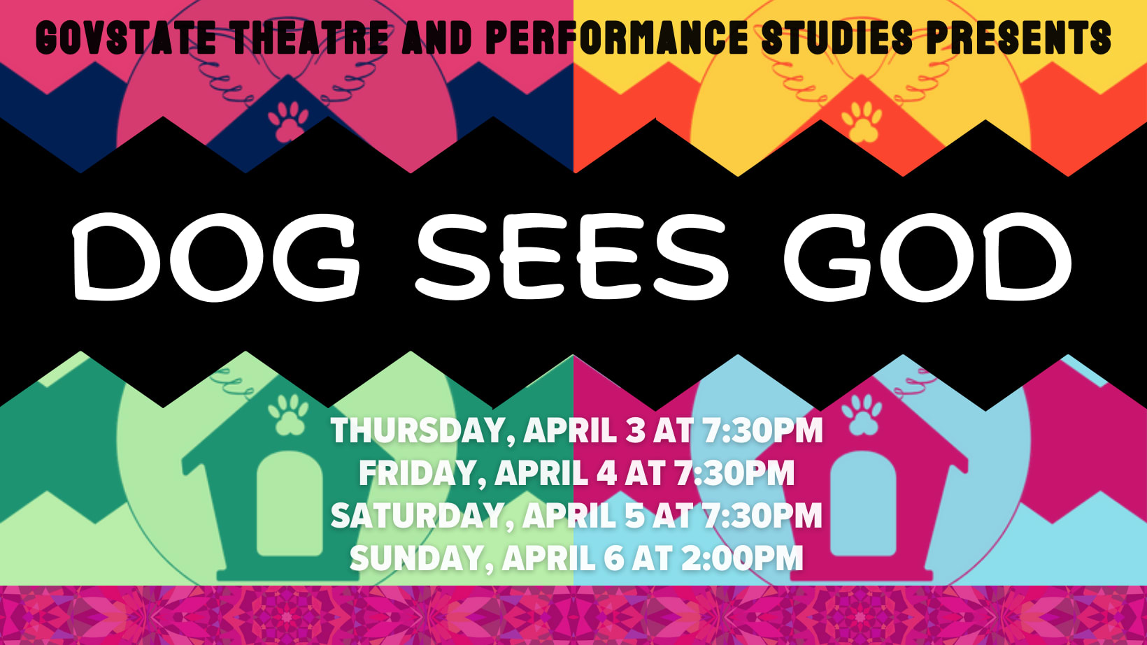 GovState Theatre and Performance Studies presents DOG SEES GOD - An 'unauthorized continuation,' this play reimagines characters from the popular comic strip Peanuts as degenerate teenagers. When CB’s dog dies from rabies, CB begins to question the existence of an afterlife. His best friend is too burnt out to provide any coherent speculation; his sister has gone goth; his ex-girlfriend has recently been institutionalized; and his other friends are too inebriated to give him any sort of solace. But a chance meeting with an artistic kid, the target of this group’s bullying, offers CB a peace of mind and sets in motion a friendship that will push teen angst to the very limits. Drug use, child sexual abuse, suicide, eating disorders, teen violence, rebellion, sexual relations, and identity are among the issues covered in this haunting and hopeful homage to the works of Charles M. Schulz.Images