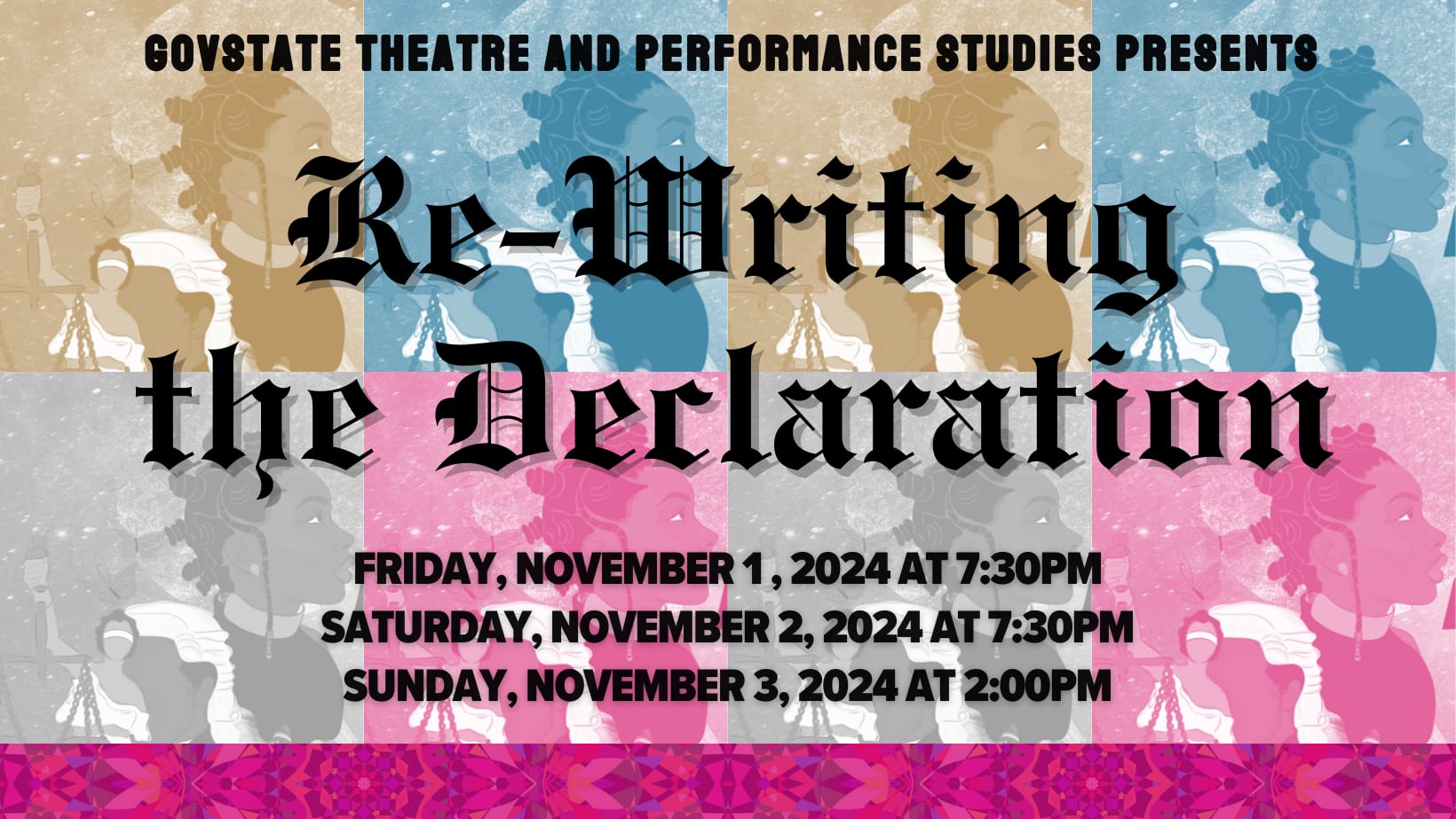 GovState Theatre and Performance Studies presents Re-Writing the Declaration - What happens when a class of young Black women and non-binary folx of color take a trip to 1776? A collage of time and space, a blend of character and self — the ensemble of Re-Writing the Declaration exists in both today and yesterday in order to change tomorrow. Believing that the founding fathers and documents never intended to include us, we consider the impacts of that founding on our lives today & realize it’s time to re-write the Declaration of Independence. On this journey, we visit some troubling moments in our collective past, while celebrating Blackness on the path towards freedom. Catalyzed by the Movement for Black Lives, Re-Writing the Declaration is a devised, participatory play inviting audiences to center Black women, and femmes, non-binary, and trans folx of color, in order to free us all.Images