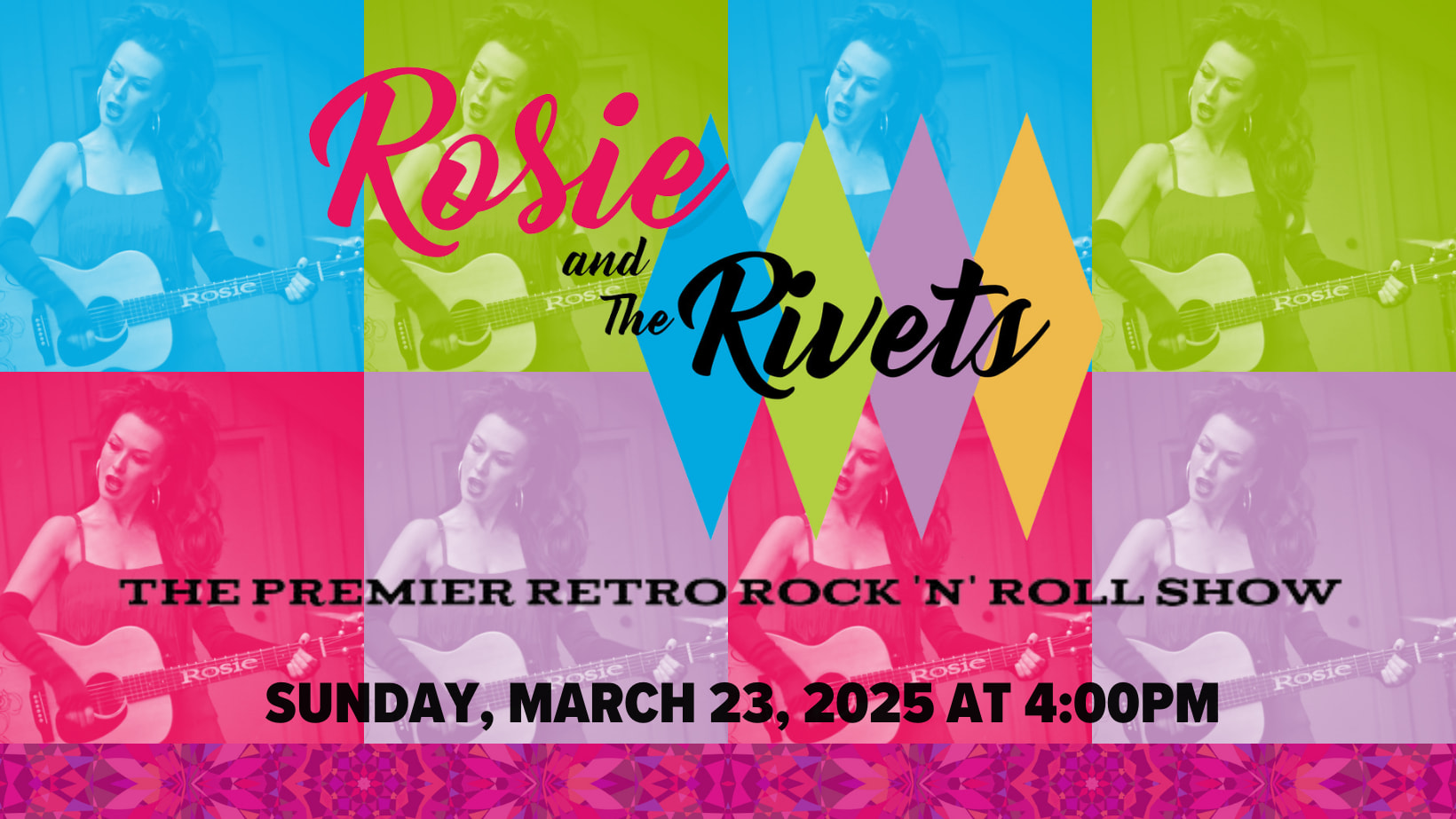 Rosie and The Rivets - An electrifying female-fronted retrospective tribute to the first ten years (1954-1964) of Rock & Roll. Along with early Rock & Roll favorites, you’ll hear Girl Group, Rockabilly, R&B, Surf, and British Invasion featuring Rosie’s powerful and versatile voice and backed by a band with extensive theater/tribute/roots music experience (members of the Rivets have worked in The Million Dollar Quartet, Buddy: The Buddy Holly Story, and The Fab Four: Beatles Tribute). Sticklers for detail, much research went into their stage production; period correct wardrobe, hair and makeup along with vintage guitars, drums, and even microphones assure you'll be in for a truly retro-cool experience.Images